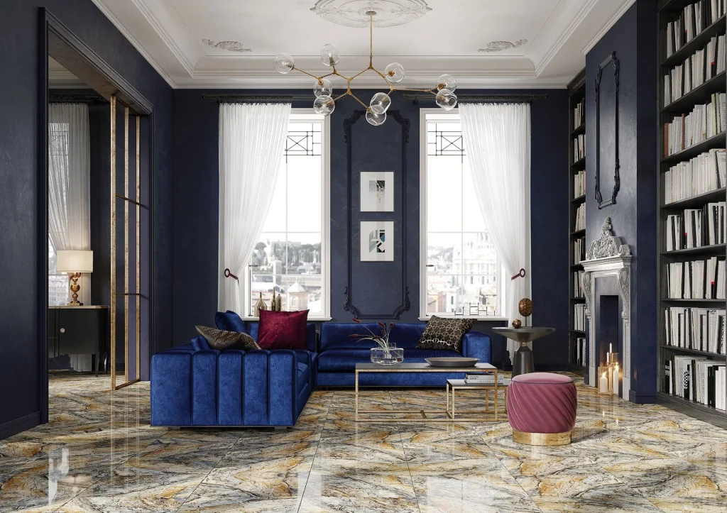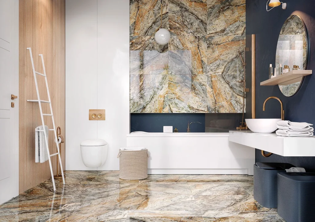 Płytki o nietypowym zestawieniu kolorystycznym, łączącym ziemiste odcienie z błękitną tonacją odznaczają się oryginalnym oraz pełnym harmonii wzornictwem. Wyrazista grafika inspirowana strukturą naturalnego kamienia tworzy wrażenie wyjątkowej głębi. Powierzchnia o wysokim połysku podnosi walory dekoracyjne gresu, przydając mu elegancji i szlachetności. Wysokiej jakości płytki są odporne na uszkodzenia mechaniczne, mróz oraz ścieranie, dzięki czemu sprawdzą się na każdej powierzchni wewnętrznej i zewnętrznej.